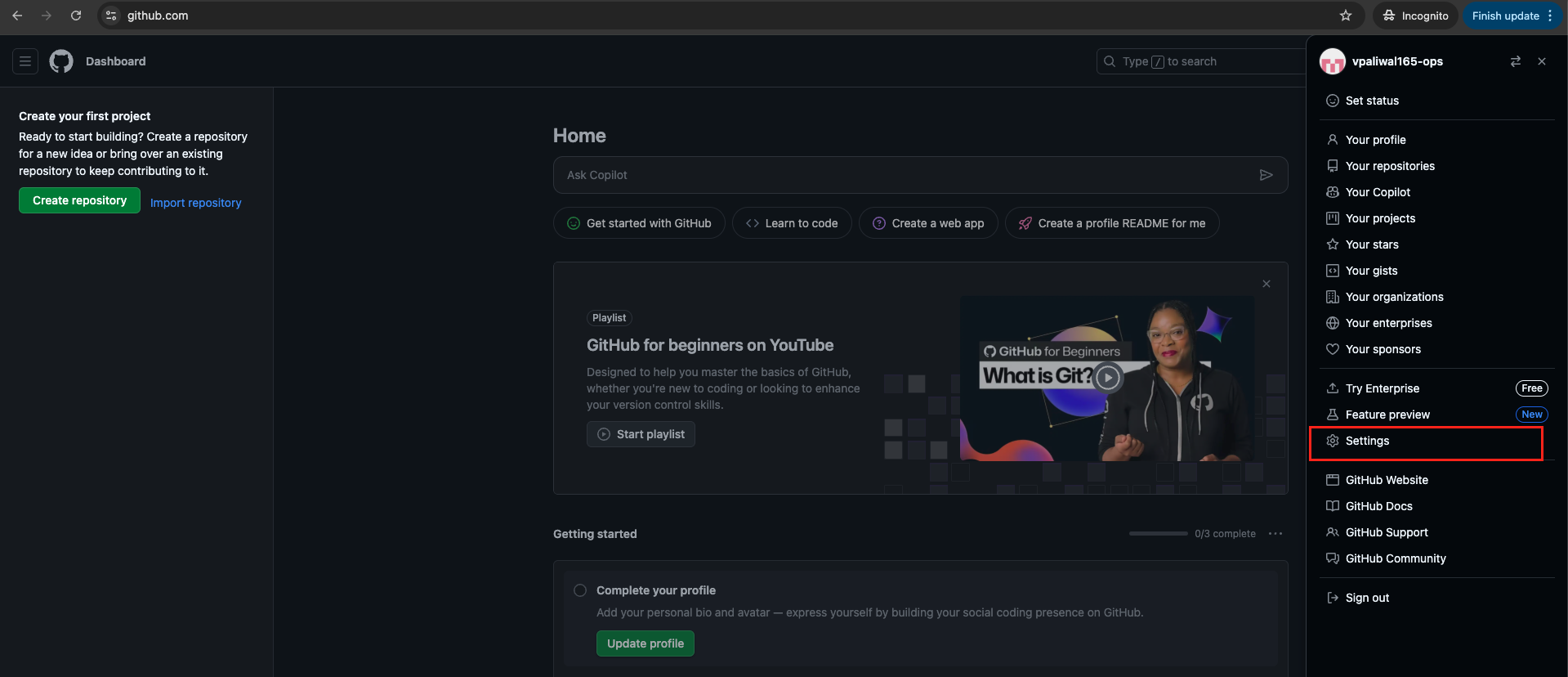Step 2: Click on the “Settings” option from your GitHub profile menu.