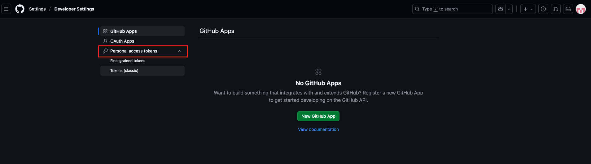Step 4: In the Developer settings tab, click on Personal access tokens, and from the dropdown, select “Tokens (classic).”