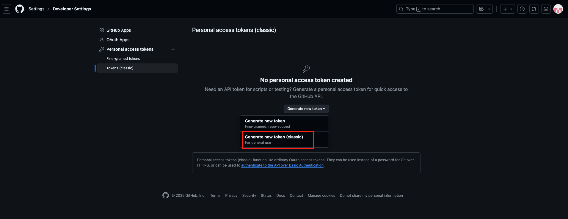 Step 5: From the “Generate new token” dropdown, select the “Generate new token (classic)” option.