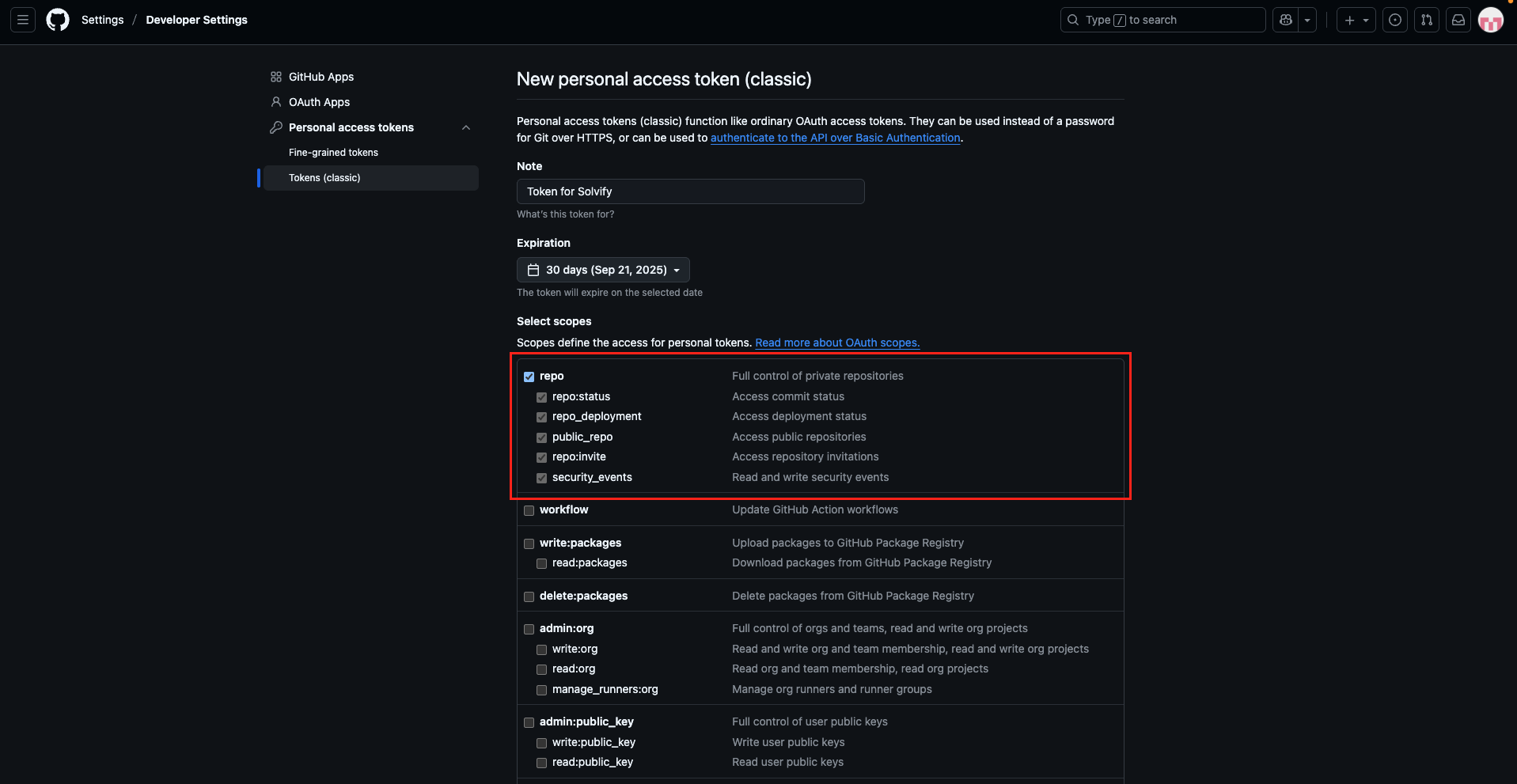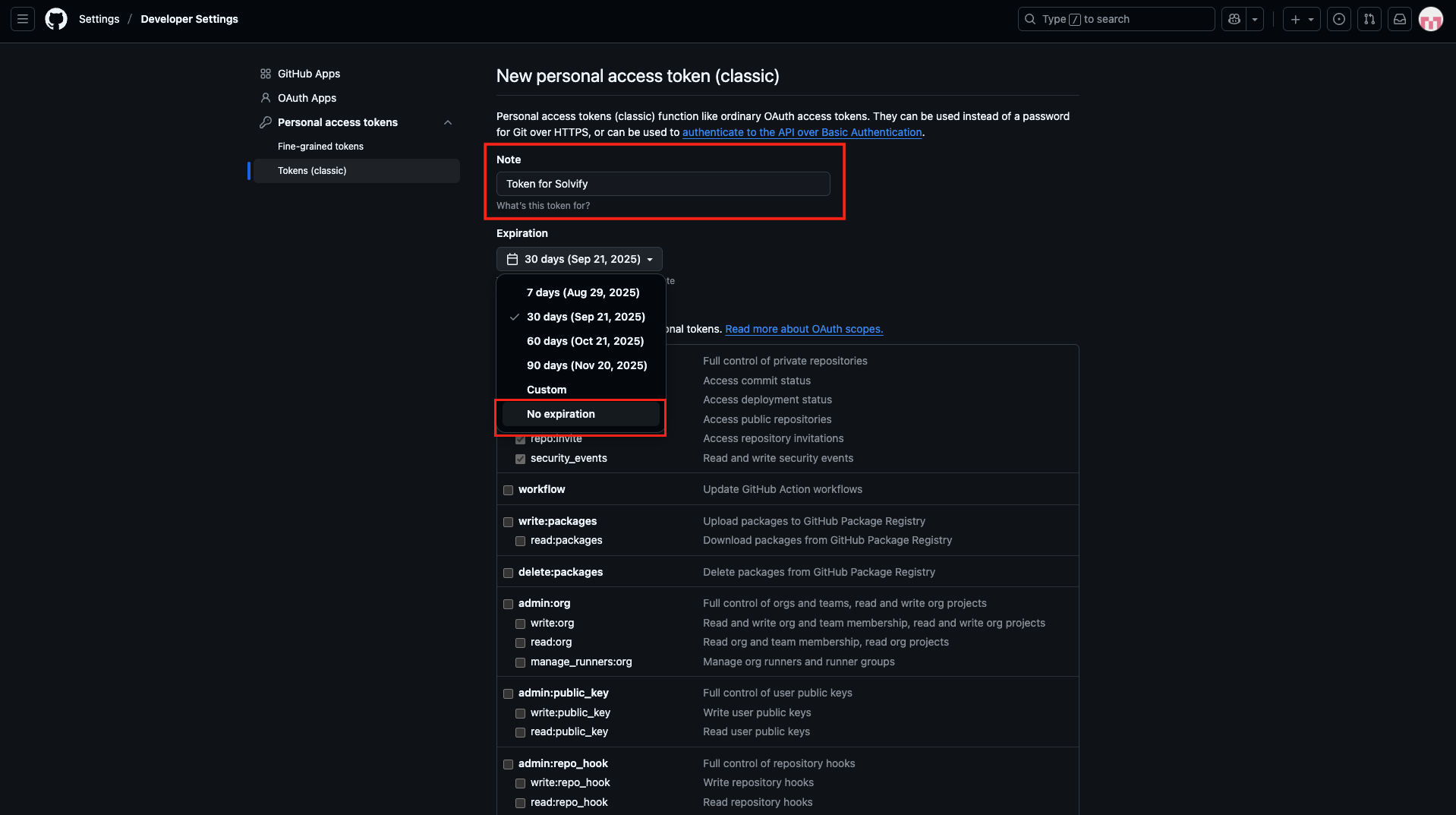 Step 6: Set the Expiration to “No Expiration” so that your Personal Access Token (PAT) remains valid indefinitely. If the token expires, Solvify won’t be able to fetch your project code, and your projects will no longer be visible to clients for purchase.